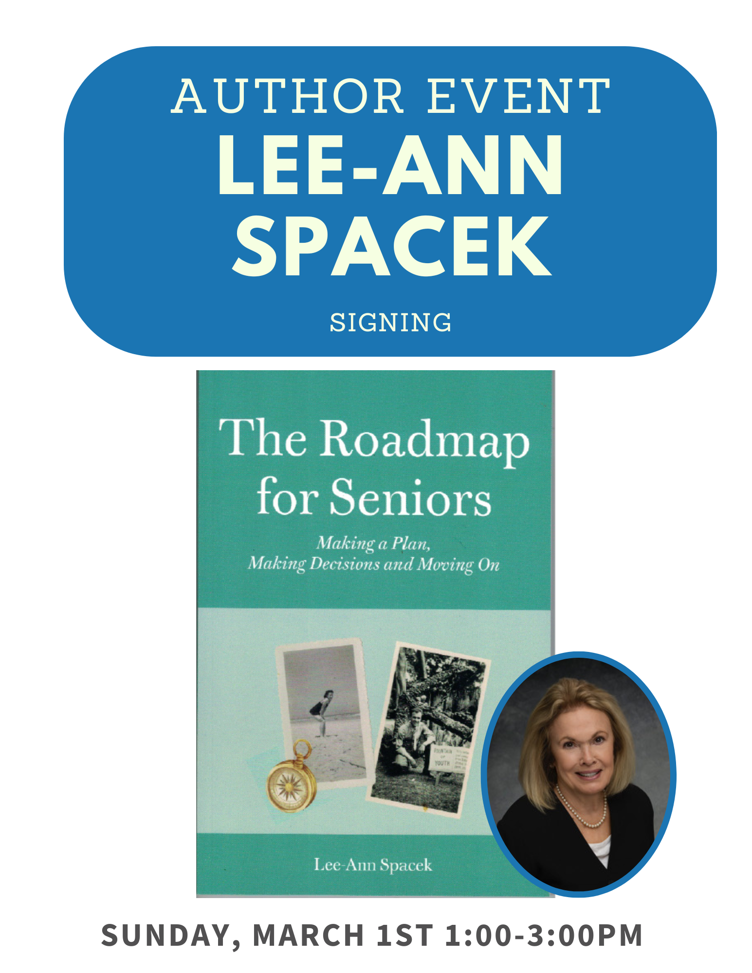Lee-Ann Spacek, author of Roadmap for Seniors, will sign books in the shop on Sunday, March 1st from 1-3 pm.